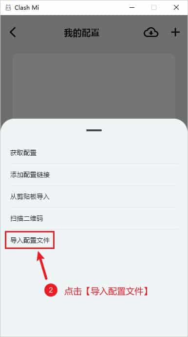 本地配置文件即通过本地文件拖拽导入,一般为无法通过远程订阅地址导入的情况下使用,可尝试在浏览器中下载配置文件后,点击界面我的配置旁边的➕图标,如下图所示。