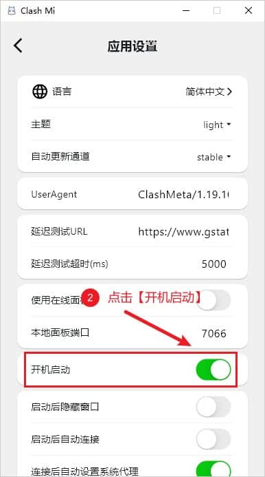 找到开机启动并开启开关即可,开启状态下按钮状态为绿色,如下图所示为开启状态。