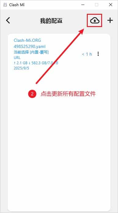 远程订阅地址即通过 URL 链接导入,一般的服务商都会直接提供Clash节点地址,直接复制服务商提供的节点订阅地址即可,点击界面我的配置旁边的➕图标,如下图所示。