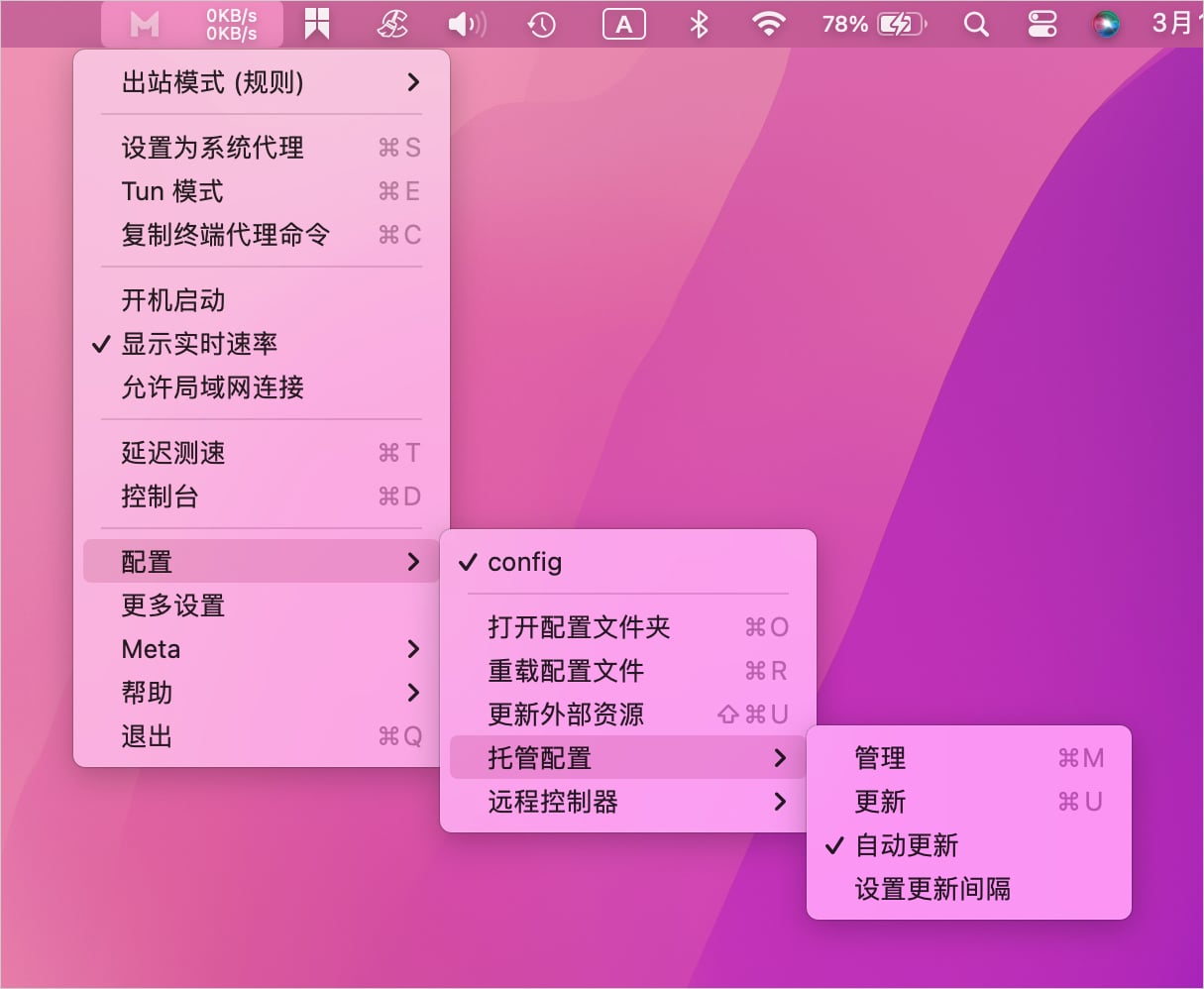 此时状态栏小喵咪图标的颜色会变色,同时使用代理上网会显示实时速率,至此Clash节点订阅地址设置完成,即可开始科学上网了。