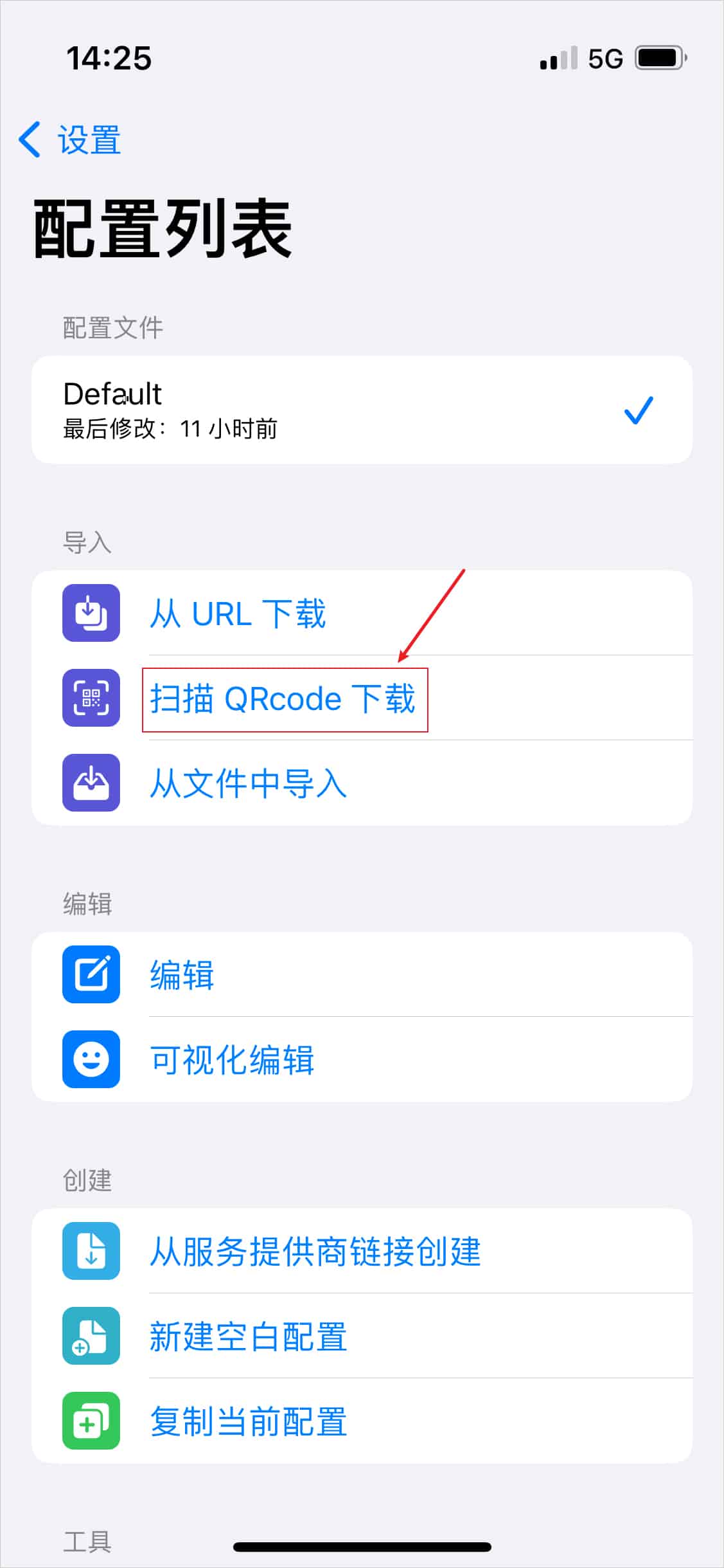 软件支持扫描二维码导入节点,在配置列表页面,点击扫描 QRcode 下载,如下图所示: