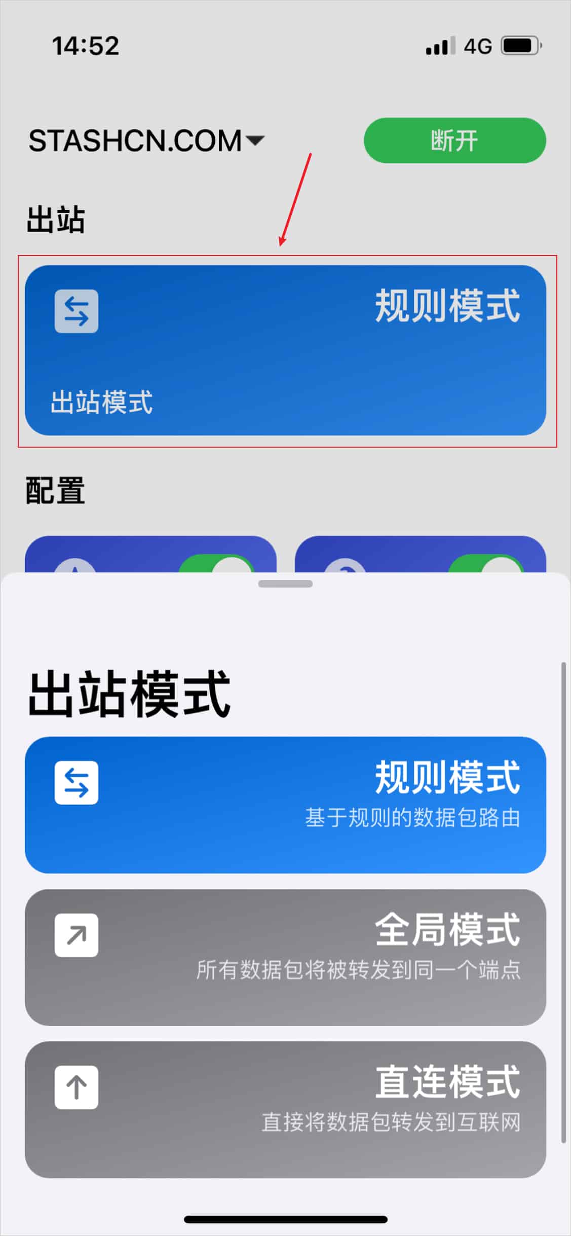 在软件首页选项卡,可以在最顶部看到出站模式,默认为规则模式,在成功启动并连接代理服务器后,直接点击出站模式就可以进行切换,如下图所示: