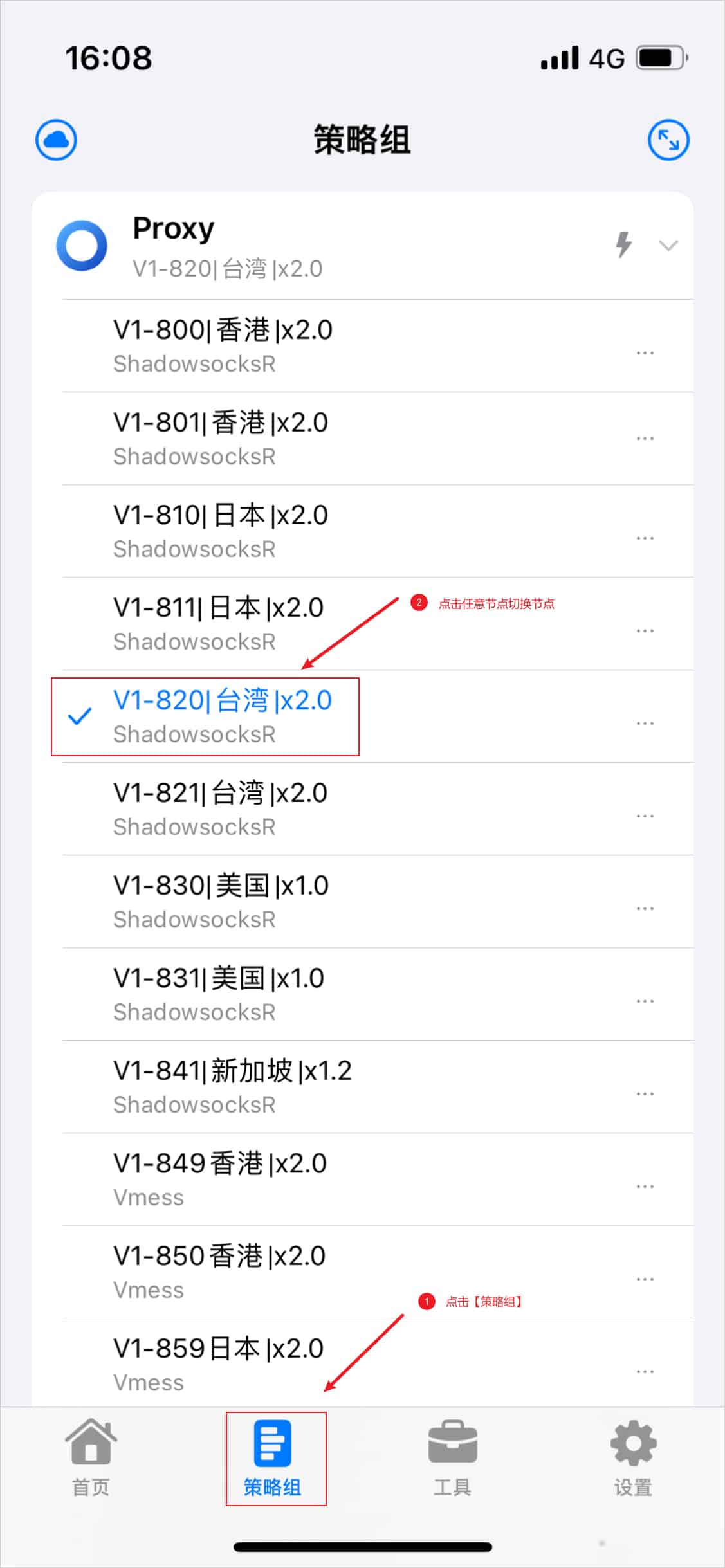 点击软件最底部菜单策略组选项卡,可以看到有很多节点,点击任意节点即可切换代理节点服务器,如下图所示: